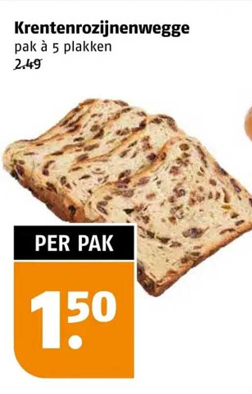 Normaal gesproken betaal je voor deze heerlijke krentenrozijnenwegge €2,49 per pak, maar tijdens deze actie koop je het nu voor maar €1,50! Dit betekent een aanzienlijke besparing en een kans om extra te genieten van deze lekkernij. Mis deze kans niet om een Heerlijke snack voordelig in huis te halen!