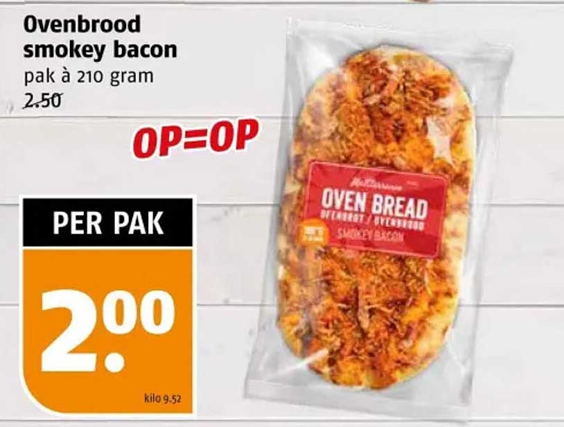 Bekijk nu de Ovenbrood smokey bacon pak à 210 gram aanbieding in de Poiesz folder. Deze aanbieding is geldig van 06-07-2025 tot en met 12-07-2025.