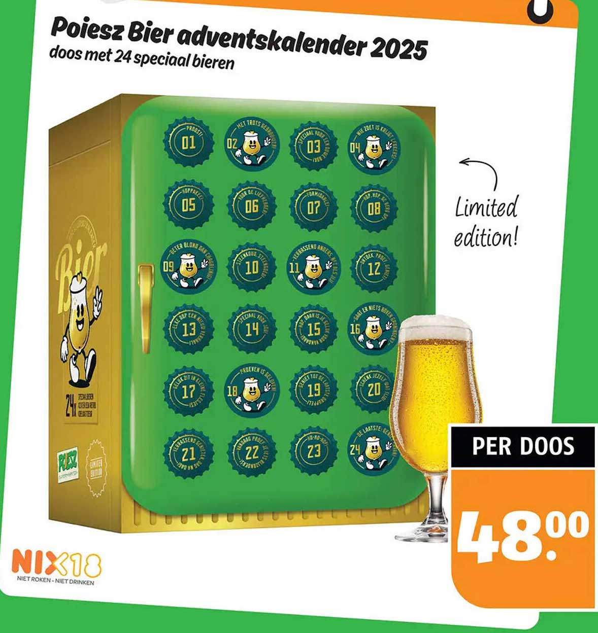 Bekijk nu de Poiesz Bier adventskalender 2025 doos met 24 speciaal bieren aanbieding in de Poiesz folder. Deze aanbieding is geldig van 20-11-2025 tot en met 23-11-2025.