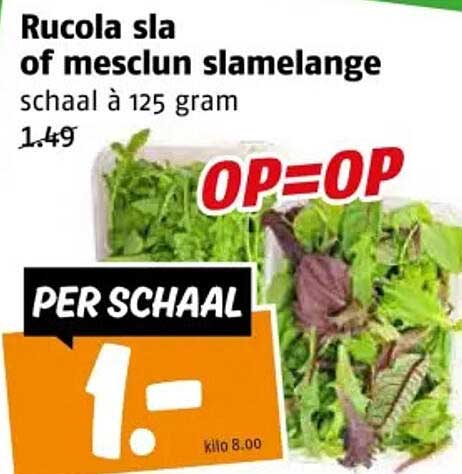 Voor slechts €1,- per schaal is dit een aanbieding die je niet wilt missen. De reguliere prijs is €1,49, wat betekent dat je nu kunt besparen! Dit is een perfecte gelegenheid om verschillende gerechten uit te proberen zonder je portemonnee te veel te belasten. Profiteer van deze aantrekkelijke aanbieding en haal de versheid van Rucola sla of mesclun in huis!