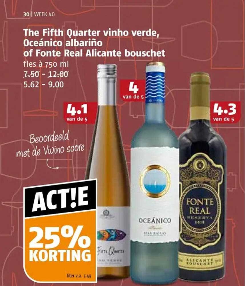 Bekijk nu de The Fifth Quarter vinho verde, Oceânico albariño of Fonte Real Alicante bouschet aanbieding in de Poiesz folder. Deze aanbieding is geldig van 28-09-2025 tot en met 04-10-2025.