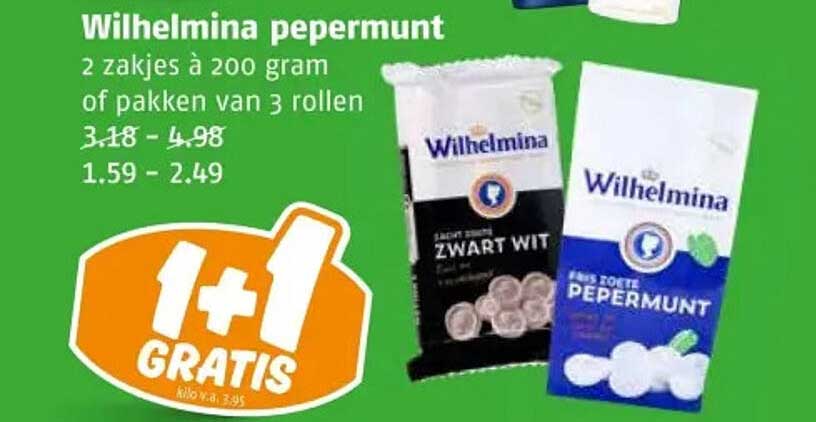 Bekijk nu de Wilhelmina pepermunt aanbieding in de Poiesz folder. Deze aanbieding is geldig van 12-10-2025 tot en met 18-10-2025.