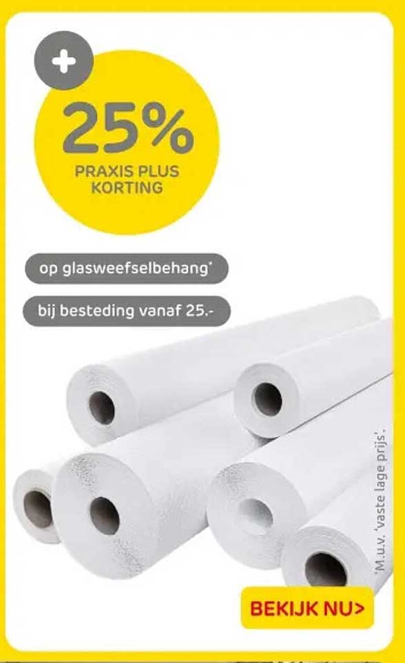Bekijk nu de 25% PRAKIS PLUS KORTING op glasweefselbehang bij besteding vanaf 25.- aanbieding in de Praxis folder. Deze aanbieding is geldig van 05-09-2025 tot en met 07-09-2025.