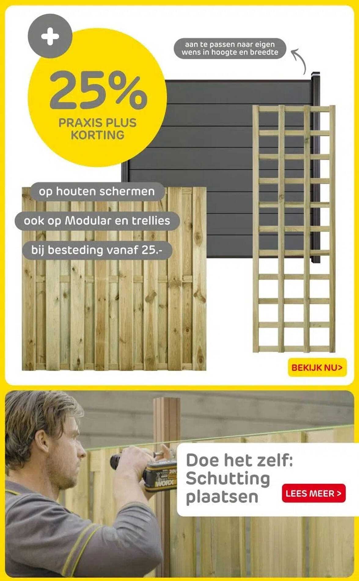 Bekijk nu de 25% PRAKIS PLUS KORTING op houten schermen ook op Modular en trellies bij besteding vanaf 25,- aanbieding in de Praxis folder. Deze aanbieding is geldig van 24-03-2025 tot en met 30-03-2025.