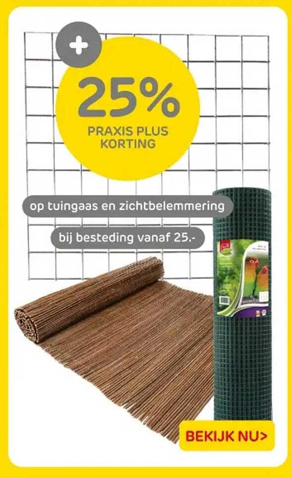 Bekijk nu de 25% PRAKIS PLUS KORTING op tuingaas en zichtbelemmering bij besteding vanaf 25.- aanbieding in de Praxis folder. Deze aanbieding is geldig van 19-09-2025 tot en met 21-09-2025.