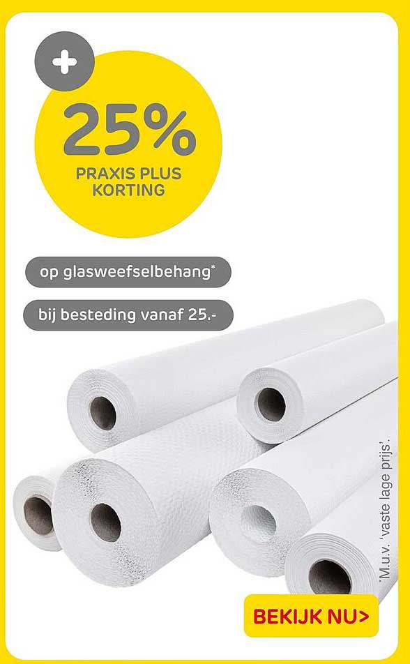 Bekijk nu de 25% PRAKTIJK PLUS KORTING op glasweefselbehang bij besteding vanaf 25.- aanbieding in de Praxis folder. Deze aanbieding is geldig van 12-09-2025 tot en met 14-09-2025.