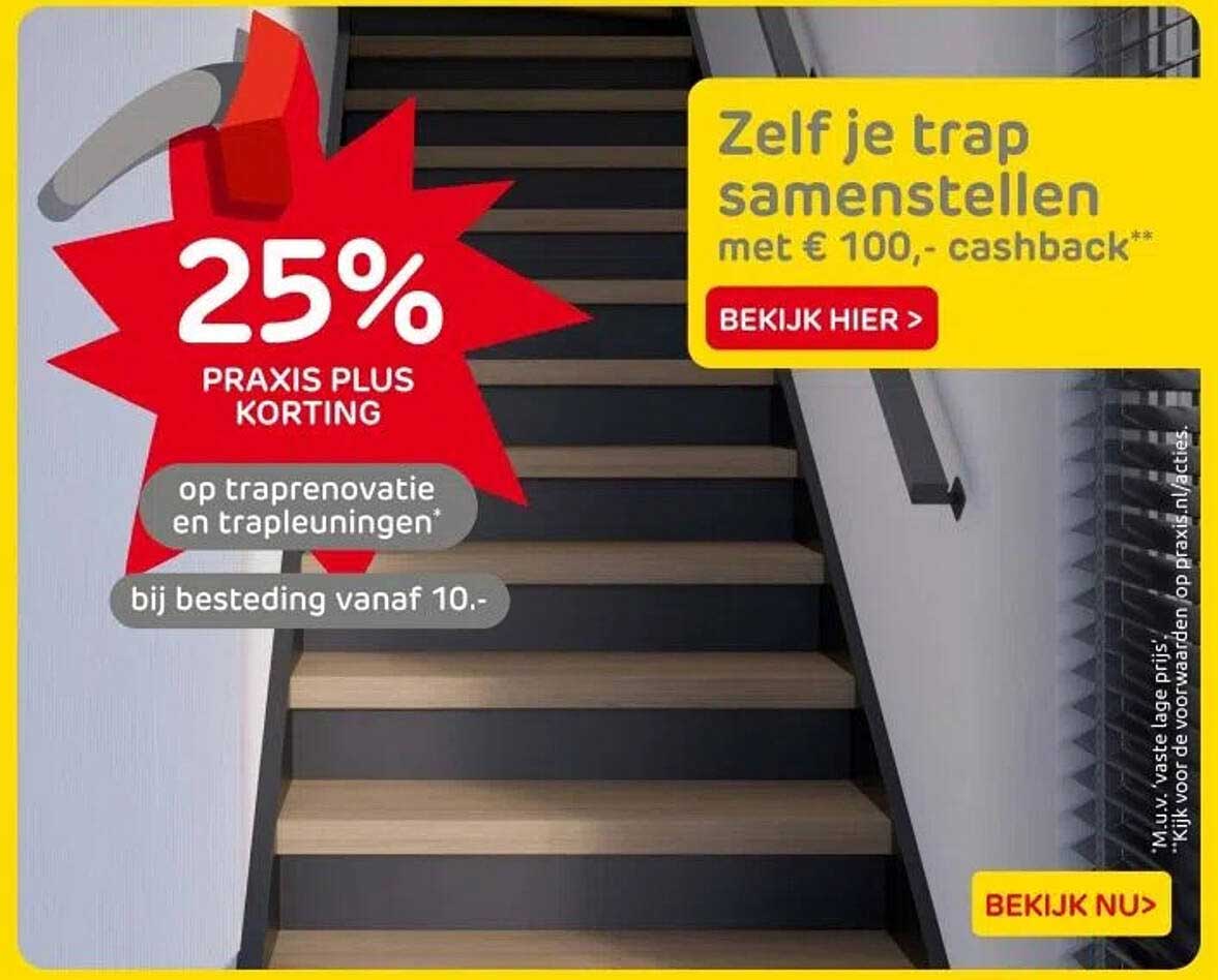 In deze aanbieding maak je gebruik van een fantastische korting van 25% op traprenovatie en trapleuningen bij Praxis. Dit is dé kans om jouw trappen een nieuwe uitstraling te geven zonder dat je hierbij je spaargeld hoeft aan te spreken. Met deze aanbieding kun je jouw trap volledig naar eigen smaak samenstellen en zelfs profiteren van €100,- cashback bij besteding van €10,- of meer.