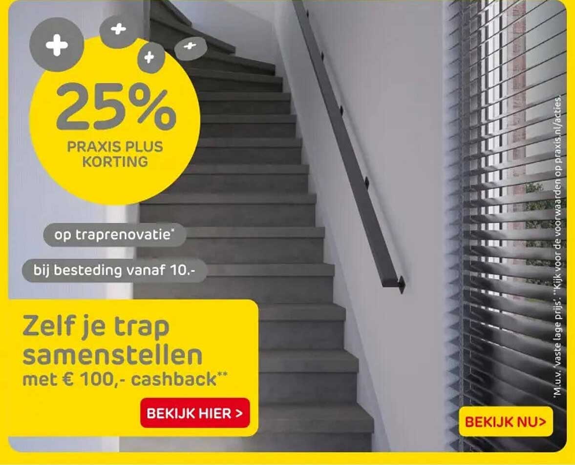 Bekijk nu de 25% PRAKTIJS PLUS KORTING op traprenovatie bij besteding vanaf 10. aanbieding in de Praxis folder. Deze aanbieding is geldig van 05-09-2025 tot en met 07-09-2025.