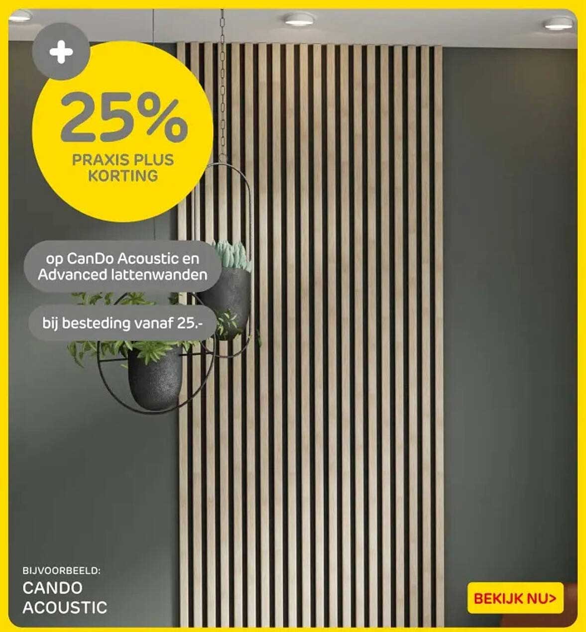 Bekijk nu de 25% PRAxis Plus korting op CanDo Acoustic en Advanced lattenwanden bij besteding vanaf 25.- aanbieding in de Praxis folder. Deze aanbieding is geldig van 10-10-2025 tot en met 12-10-2025.