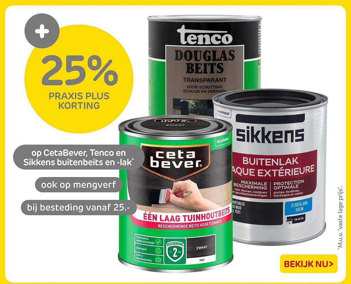 Bekijk nu de 25% PRAxis Plus korting op CetaBever, Tenco en Sikkens buitenbeits en -lak aanbieding in de Praxis folder. Deze aanbieding is geldig van 26-09-2025 tot en met 28-09-2025.