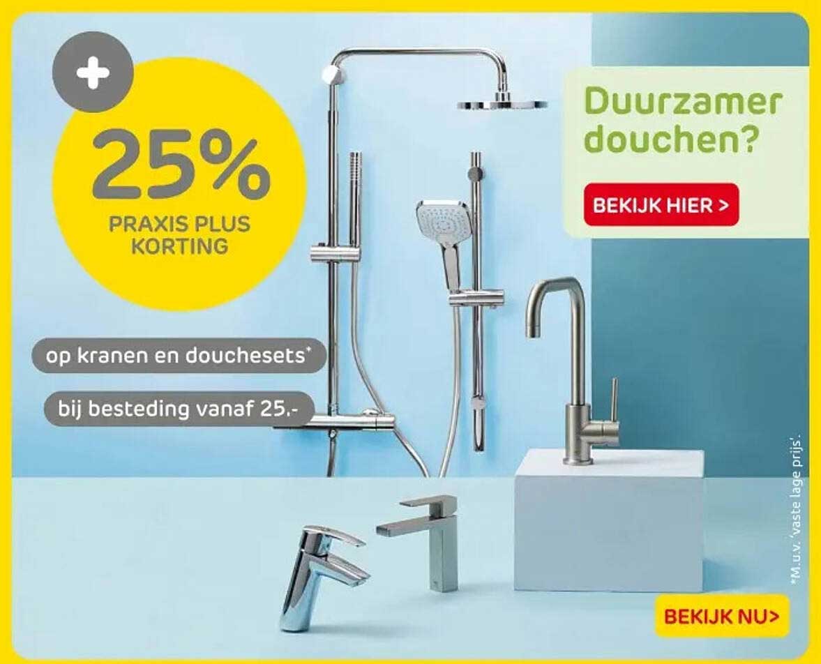 Bekijk nu de 25% PRAxis Plus korting op kranen en douchetsets bij besteding vanaf 25,- aanbieding in de Praxis folder. Deze aanbieding is geldig van 19-09-2025 tot en met 21-09-2025.