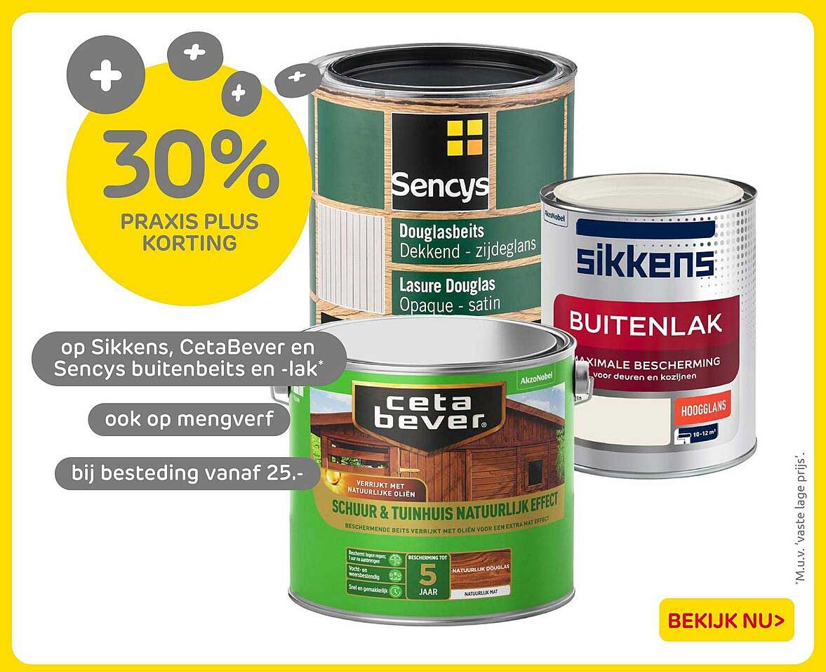 Bekijk nu de 30% PRAKIS PLUS KORTING op Sikkens, CetaBever en Sencys buitenbeits en -lak aanbieding in de Praxis folder. Deze aanbieding is geldig van 29-08-2025 tot en met 31-08-2025.