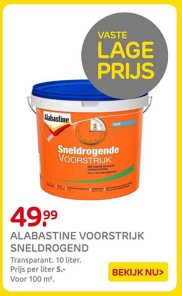 Maak je schilderprojecten een stuk efficiënter met de Alabastine Sneldrogende Voorstrijk. Deze geweldige aanbieding biedt je de mogelijkheid om te profiteren van een hoogwaardige voorstrijk die bekend staat om zijn snelle droging en uitstekende hechting. Perfect voor elke doe-het-zelver die snel resultaat wil zonder in te boeten op kwaliteit.