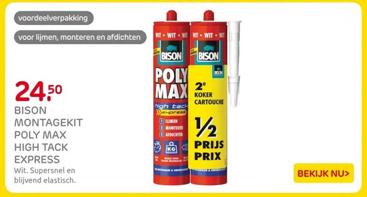Ben je op zoek naar een betrouwbare lijmoplossing voor jouw klussen? Dan is de Bison Montagekit Poly Max High Tack Express de perfecte keuze! Deze krachtige montagekit biedt ultieme hechting en is speciaal ontworpen voor het lijmen, monteren en afdichten van verschillende materialen. Deze aanbieding is geldig van 10 tot en met 12 oktober 2025. Dit is hét moment om je voorraad aan te vullen!
