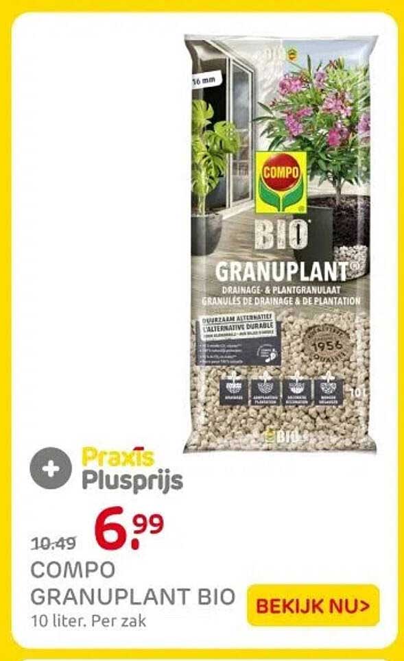 Ben jij op zoek naar de perfecte oplossing voor jouw planten? Dan is de COMPO GRANUPLANT BIO de ideale keuze! Deze hoogwaardige granulaat is perfect voor drainage en als potgrond, waardoor je planten nooit meer te veel water krijgen. Met deze aanbieding van slechts €6,99 (normaal €10,49) haal je deze kans niet te laat binnen!
