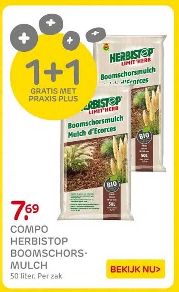 Wil je je tuin laten stralen en tegelijkertijd zorgen voor een gezonde bodem? Dan is de Compo Herbistop Boomschorsmulch de perfecte keuze voor jou! Met deze aanbieding krijg je niet alleen één zak van 50 liter, maar ook een tweede zak gratis bij aankoop met Praxis Plus. Dit maakt het een ideale gelegenheid om je tuinonderhoud eenvoudiger en voordeliger te maken.