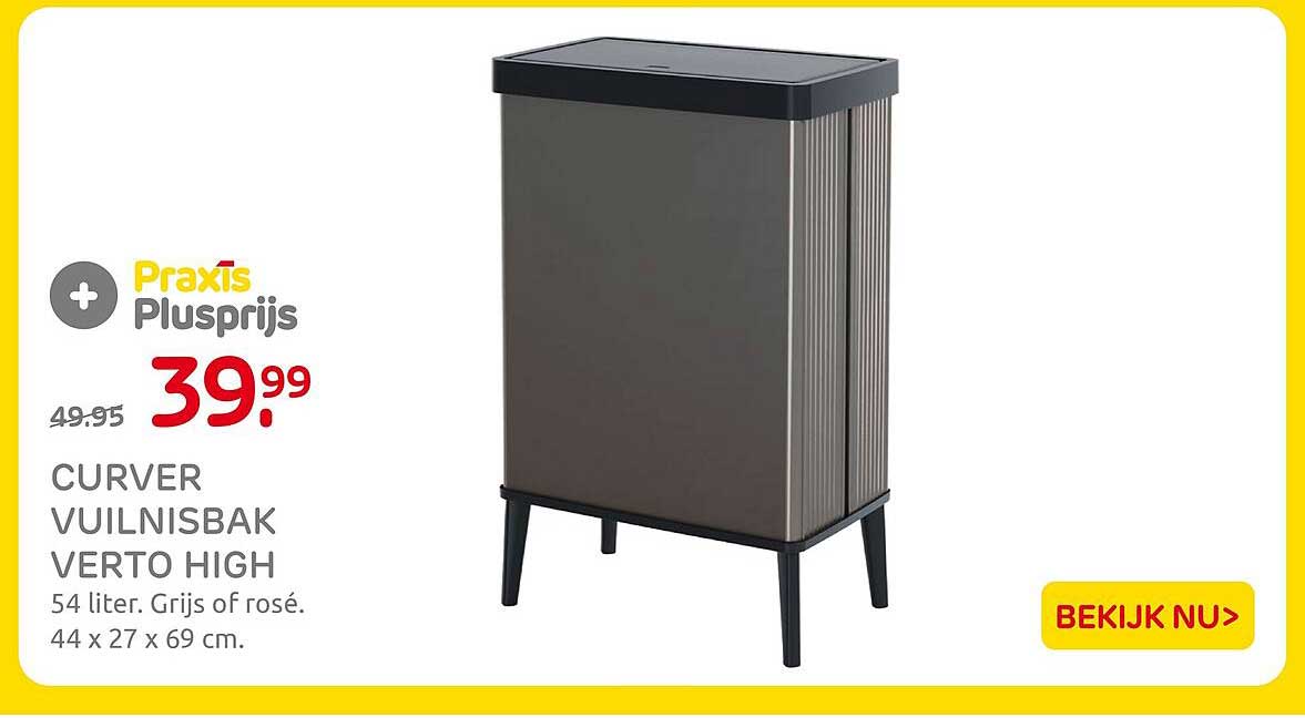 De CURVER VUILNISBAK VERTO HIGH is nu verkrijgbaar voor slechts €39,99, wat een geweldige korting is ten opzichte van de reguliere prijs van €49,95. Dit betekent dat je €10,- bespaart, wat je de kans biedt om een kwaliteitsproduct aan te schaffen tegen een zeer aantrekkelijke prijs. Dit is de perfecte gelegenheid om je huis een upgrade te geven met een stylish product.