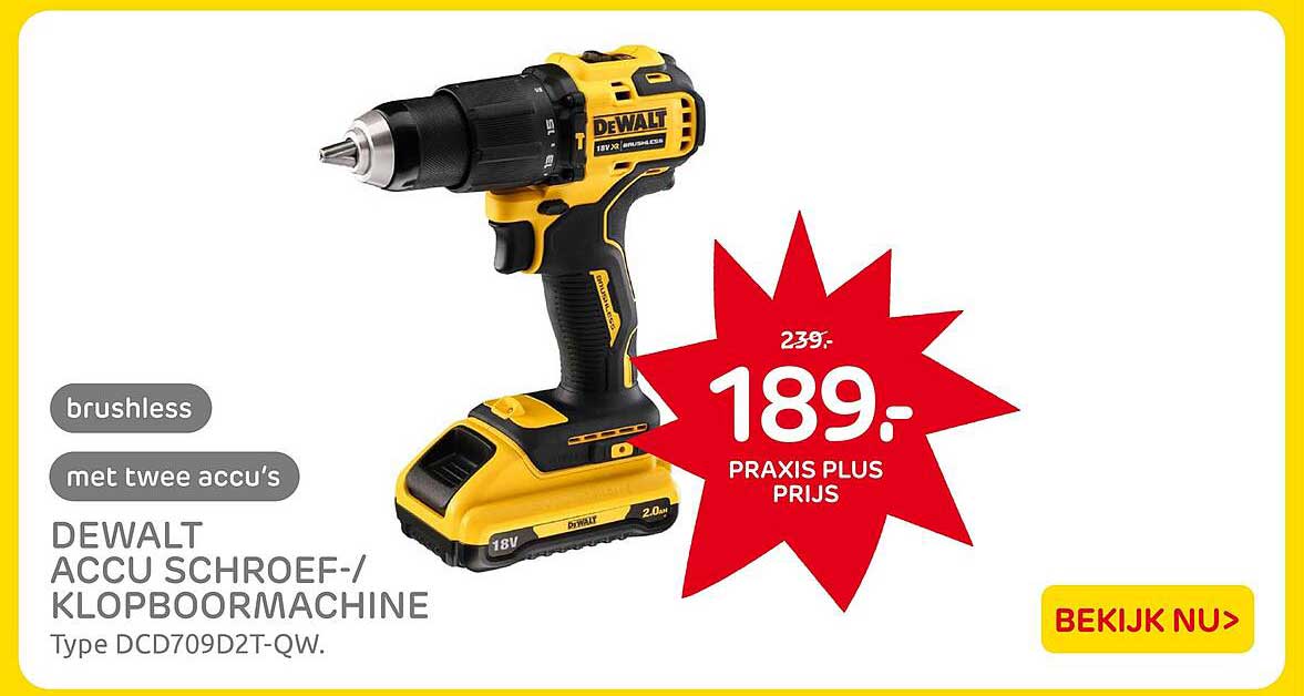 Bekijk nu de DEWALT ACCU SCHROEF-/KLOPBOORMACHINE Type DCD709D2T-QW aanbieding in de Praxis folder. Deze aanbieding is geldig van 10-06-2025 tot en met 15-06-2025.