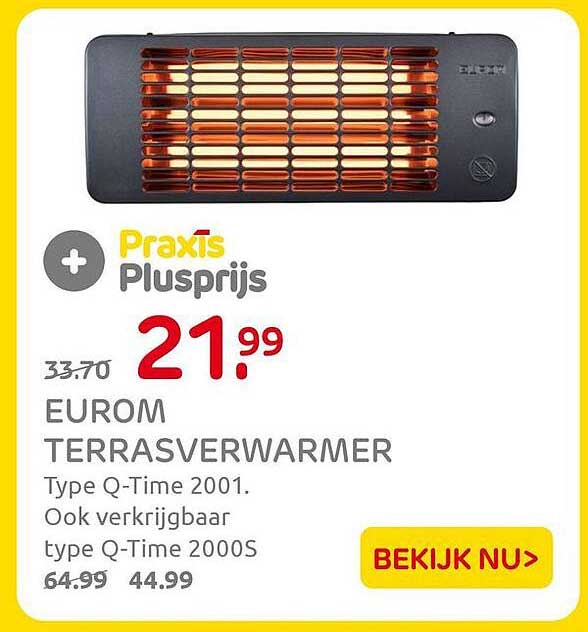 Bekijk nu de EUROM TERRASVERWARMER aanbieding in de Praxis folder. Deze aanbieding is geldig van 26-09-2025 tot en met 28-09-2025.
