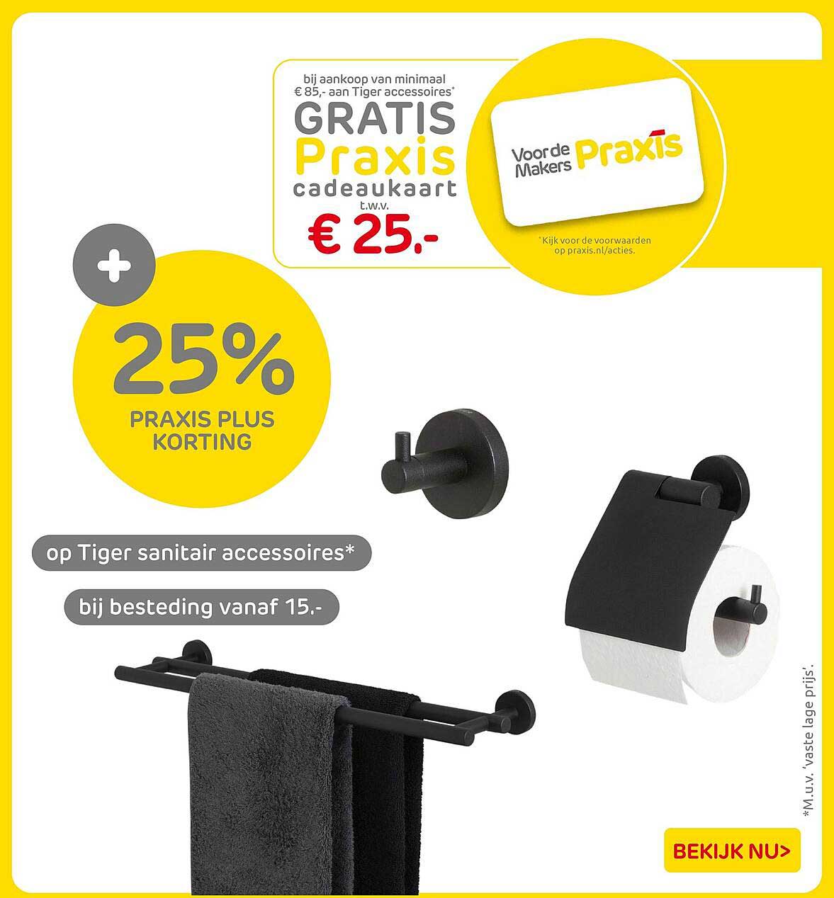 Bekijk nu de Gratis Praxis cadeautkaart t.w.v. € 25,- bij aankoop van minimaal € 85,- aan Tiger accessoires* + 25% Praxis Plus korting op Tiger sanitair accessoires* bij besteding vanaf 15,- aanbieding in de Praxis folder. Deze aanbieding is geldig van 03-10-2025 tot en met 05-10-2025.