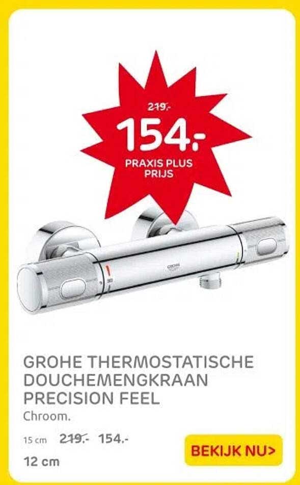 Wil je altijd genieten van een perfecte douche? Dan is de GROHE Thermostatische Douchemengkraan Precision Feel iets voor jou! Deze kwaliteit kraan zorgt ervoor dat je altijd de juiste watertemperatuur kunt instellen, zonder dat je bang hoeft te zijn voor onverwachte temperatuurschommelingen. Van 12 mei tot en met 18 mei is deze topdeal te vinden bij Praxis voor een ongelooflijk scherpe prijs!