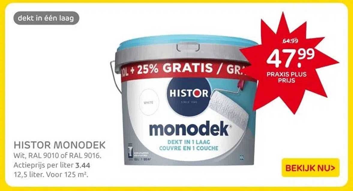 Ben je op zoek naar een kwalitatieve verf die perfect dekt in één laag? Maak dan kennis met de HISTOR MONODEK! Deze verf is speciaal ontwikkeld voor binnen- en buitentoepassingen en biedt een uitstekende dekking. Met een actieverpakking van 12,5 liter heb je voldoende verf voor een groot project, en voilà, je kunt snel weer genieten van een frisse uitstraling in je huis.