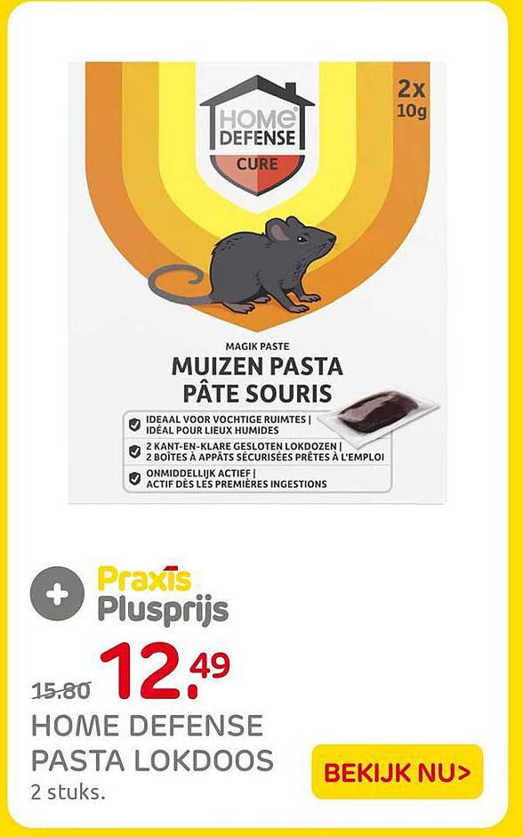 De Home Defense Pasta Lokdoos is nu verkrijgbaar voor de prijs van €12,49, wat een significante besparing is ten opzichte van de reguliere prijs van €15,80. Deze aanbieding is dan ook een unieke kans om te profiteren van een hoogwaardige muizenbestrijdingsoplossing voor een aantrekkelijke prijs. Laat deze kans niet liggen en zorg ervoor dat je snel je huis kan ontdoen van muizen!