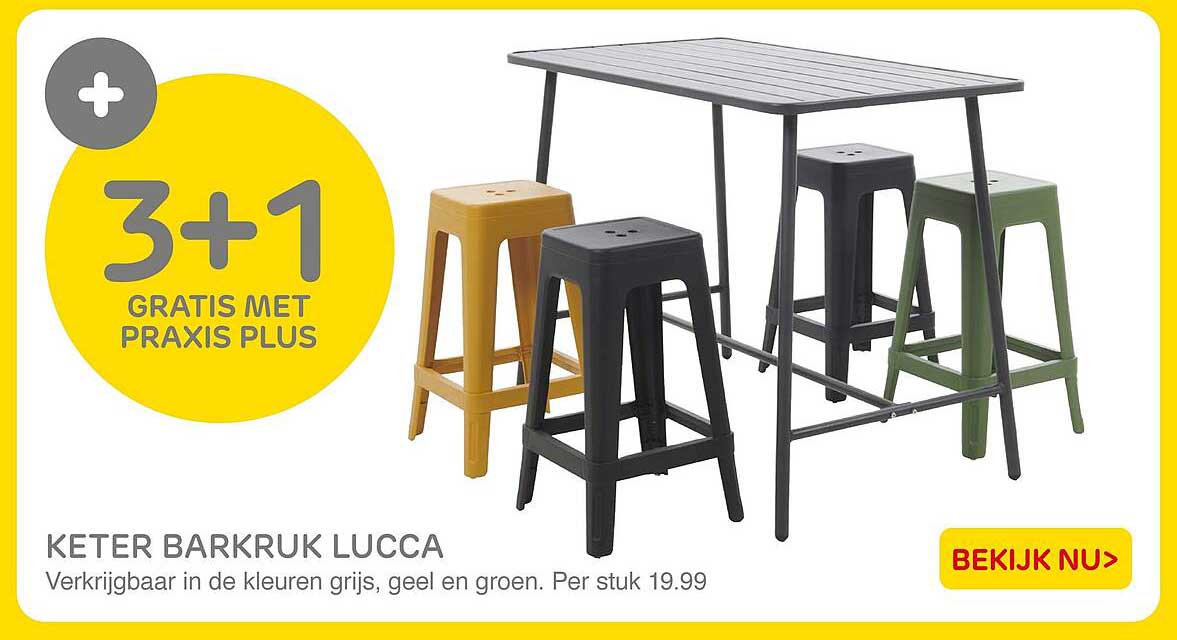 Ben je op zoek naar een stijlvolle en praktische barkruk voor je tuin of terras? Kijk dan snel hier! De KETER Barkruk Lucca is niet alleen een echte blikvanger, maar biedt ook het comfort dat je nodig hebt voor aangename momenten buiten. Met deze aanbieding profiteren van een bijzondere actie: koop drie barkrukken en ontvang er één gratis bij met Praxis Plus. Dit is dé kans om je buitenruimte een upgrade te geven!