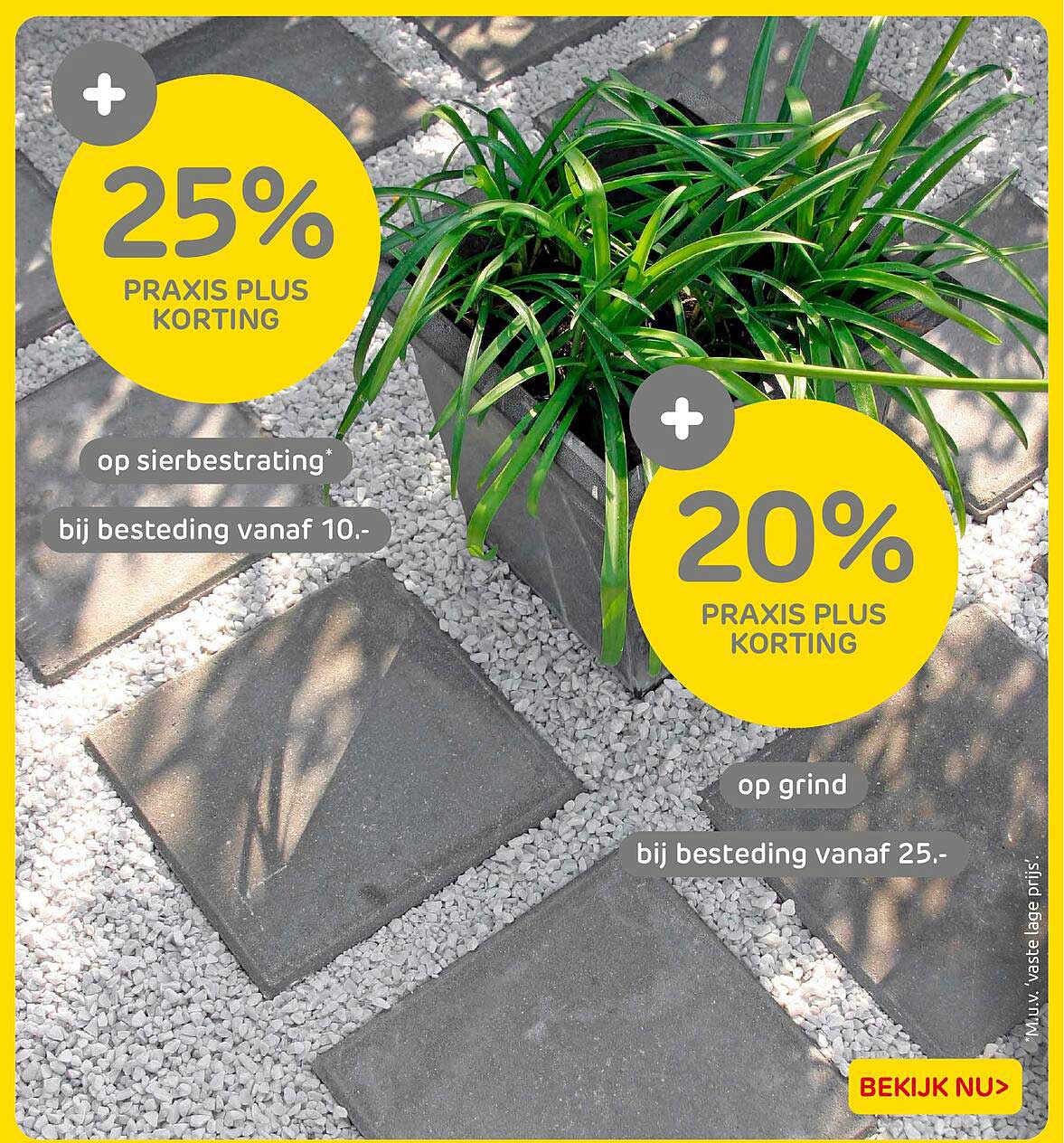Bekijk nu de op sierbestrating* bij besteding vanaf 10.- aanbieding in de Praxis folder. Deze aanbieding is geldig van 20-06-2025 tot en met 22-06-2025.