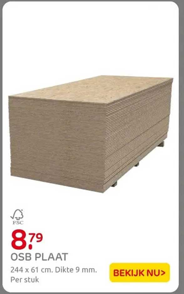 Ben je op zoek naar een hoogwaardige en veelzijdige plaat voor jouw bouwprojecten? Dan is de OSB PLAAT, met afmetingen van 244 x 61 cm en een dikte van 9 mm, de perfecte keuze. Deze aanbieding is slechts geldig van 5 september tot en met 7 september 2025, dus mis het niet! Met een prijs van slechts €8,79 per stuk, kun je jouw projecten snel en kosten effectief uitvoeren. Of je nu een professional bent of een doe-het-zelver, deze plaat biedt uitstekende mogelijkheden voor diverse toepassingen.
