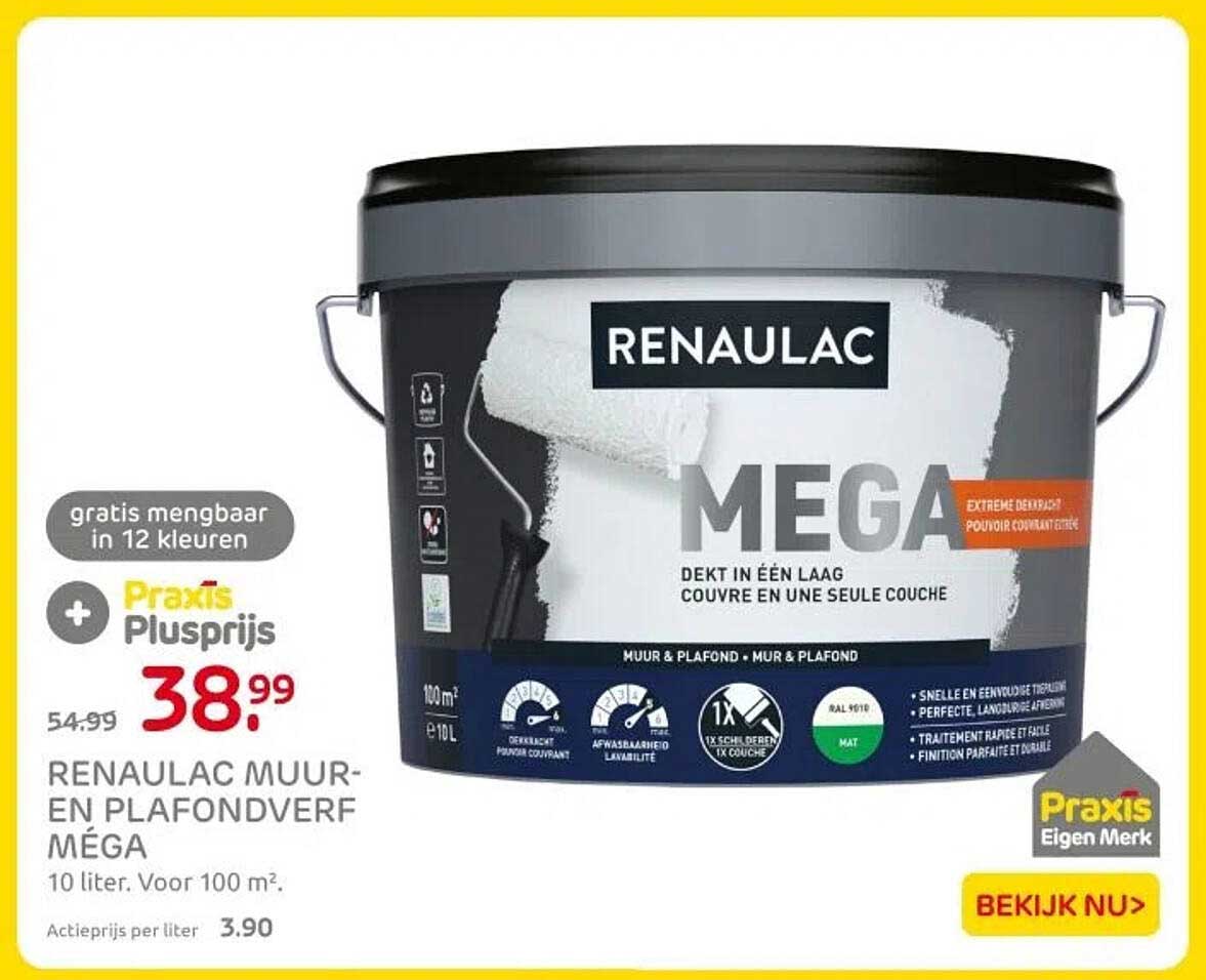 Ben je op zoek naar een kwalitatieve verf die je muren en plafonds een frisse uitstraling geeft? Zoek niet verder! Op deze pagina vind je een fantastische aanbieding voor de Renaulac Muur- en Plafondverf Méga. Deze verf dekt in één laag, wat het schilderen een stuk eenvoudiger en sneller maakt. Met een inhoud van 10 liter en een dekking voor een oppervlakte van 100 m², is dit een uitmuntende keuze voor zowel de doe-het-zelver als de professional.
