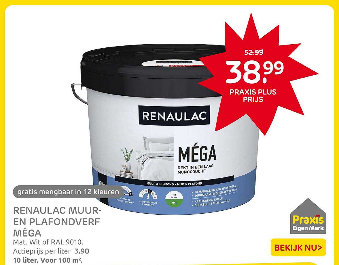 Ben je op zoek naar de perfecte verf voor je muren en plafonds? Kijk dan niet verder! Op deze pagina vind je een geweldige aanbieding voor de Renaulac Muur- en Plafondverf Méga. Met deze kwalitatieve verf verfris je eenvoudig je interieur, en dat voor een scherpe prijs. De aanbieding is geldig van 10 juni tot en met 15 juni 2025, dus mis deze kans niet!