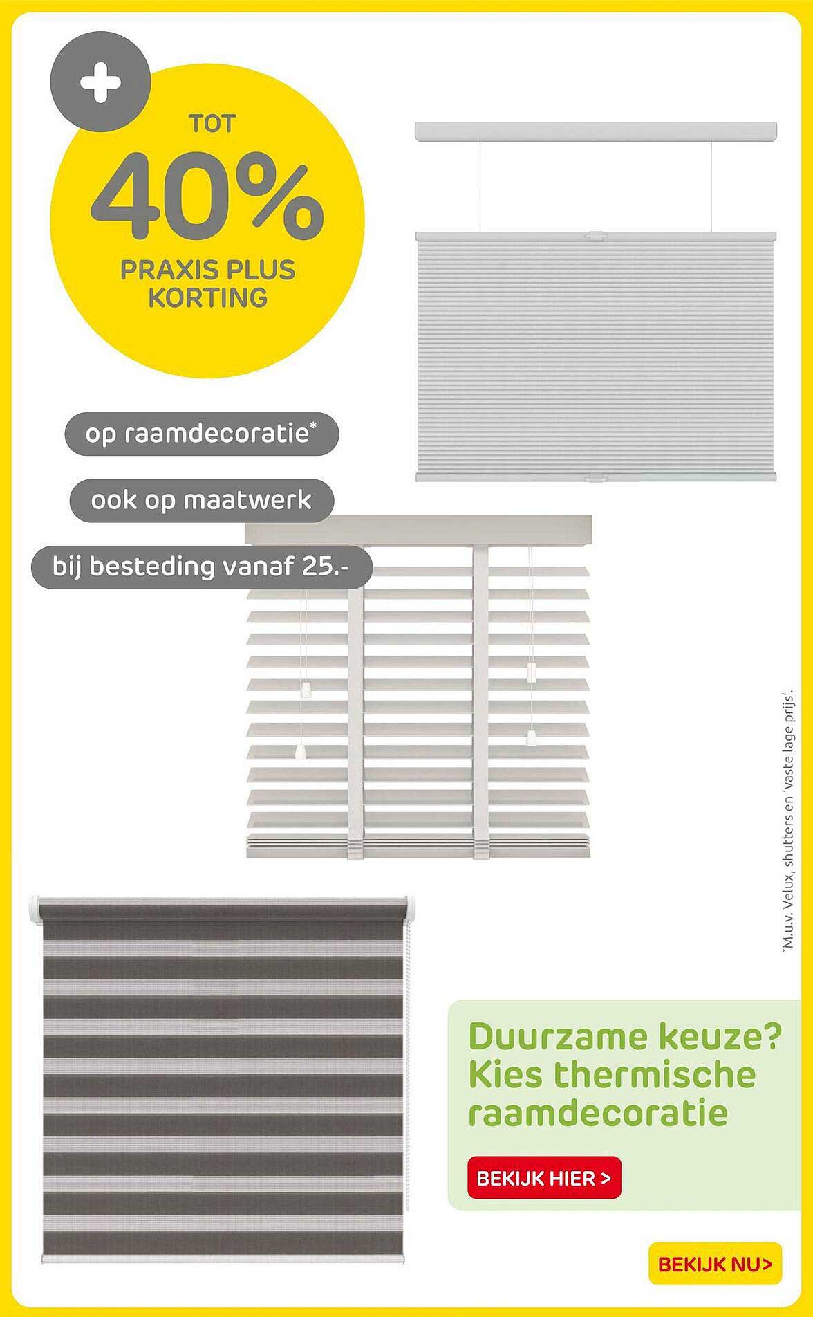 Deze aanbieding van Praxis is een uitstekende kans om je woning te verfraaien met stijlvolle raamdecoratie. Of je nu op zoek bent naar complete verduistering of juist voor een frisse lichtinval wilt gaan, hier vind je precies wat je nodig hebt. Met kortingen tot maar liefst 40% op raamdecoratie, maak je je huis niet alleen mooier, maar ook voordeliger.