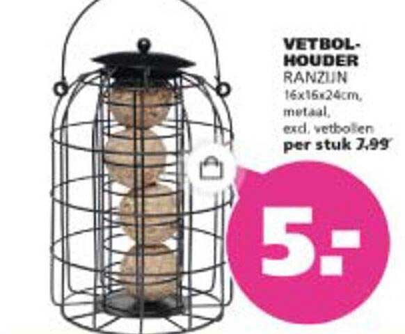 Normaal gesproken kost deze vetbolhouder €7,99, maar nu krijg je hem voor slechts €5,-! Dit biedt je een besparing van maar liefst €2,99. Deze aanbieding is perfect voor iedereen die van vogels houdt en zijn of haar tuin een nieuwe levensstijl wil geven zonder diep in de buidel te tasten.
