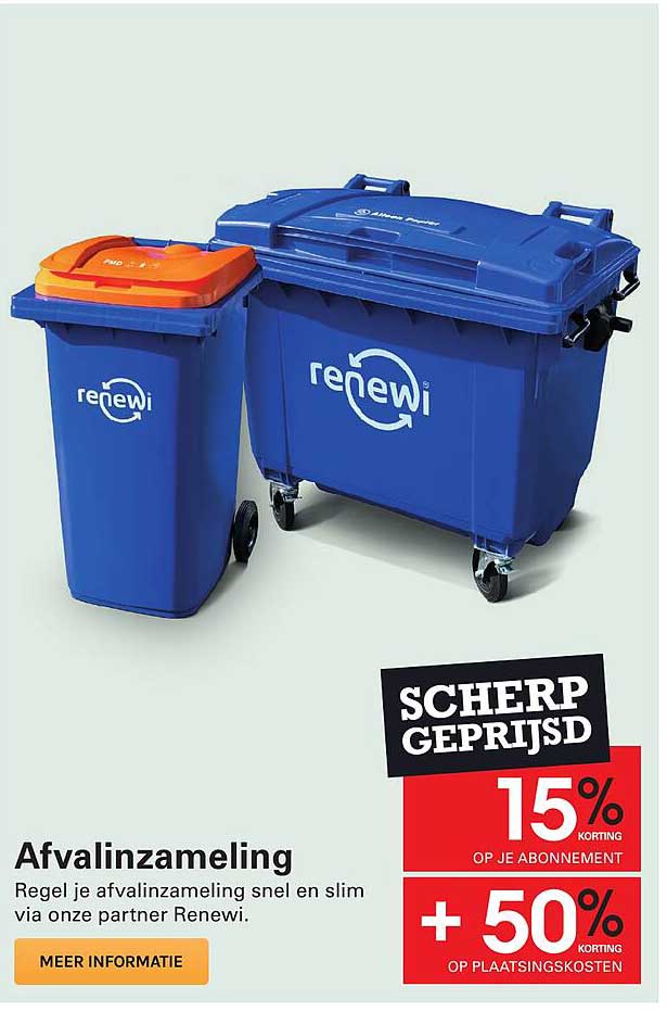 Ben je op zoek naar een handige oplossing voor je afvalinzameling? Dan is deze aanbieding zeker iets voor jou! Met de afhaalservice van Renewi regel je je afvalinzameling snel en slim. Deze aanbieding biedt je niet alleen gemak, maar ook flinke kortingen die je portemonnee een plezier doen.