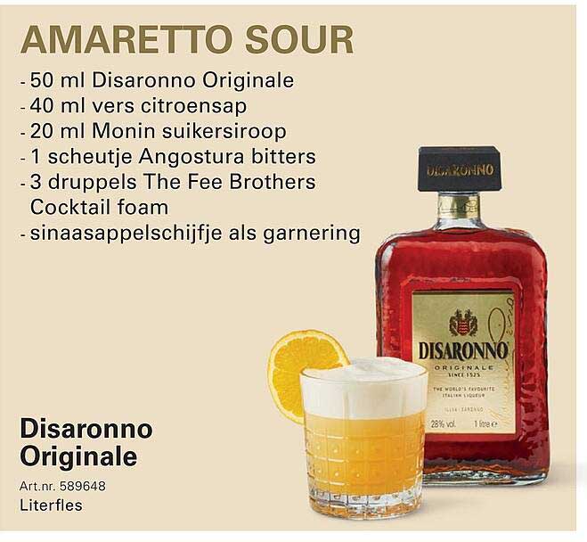 Maak je zomerse avonden onvergetelijk met de verfrissende Amaretto Sour. Deze klassieke cocktail combineert de zoete en nootachtige smaken van Disaronno Originale met de frisse kick van citroensap. Perfect voor zowel een feestelijke gelegenheid als een rustige avond thuis. Waarom de Amaretto Sour een goede keuze is? Omdat het de ideale balans biedt tussen zoetheid en zuurheid, dat elke sip een genot maakt.