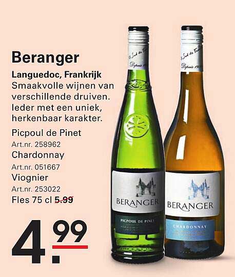 Kortom, als je op zoek bent naar een heerlijke wijn die je niet teleur zal stellen, dan is deze aanbieding van Beranger precies wat je nodig hebt. Met een prijs van slechts €4,99 voor een fles van 75 cl, is dit een uitstekende kans om kwaliteitswijnen te ontdekken uit de regio Languedoc, Frankrijk. De smaken van de Picpoul de Pinet en Chardonnay zijn perfect voor elke gelegenheid, of het nu gaat om een gezellige avond thuis of een feestje met vrienden.