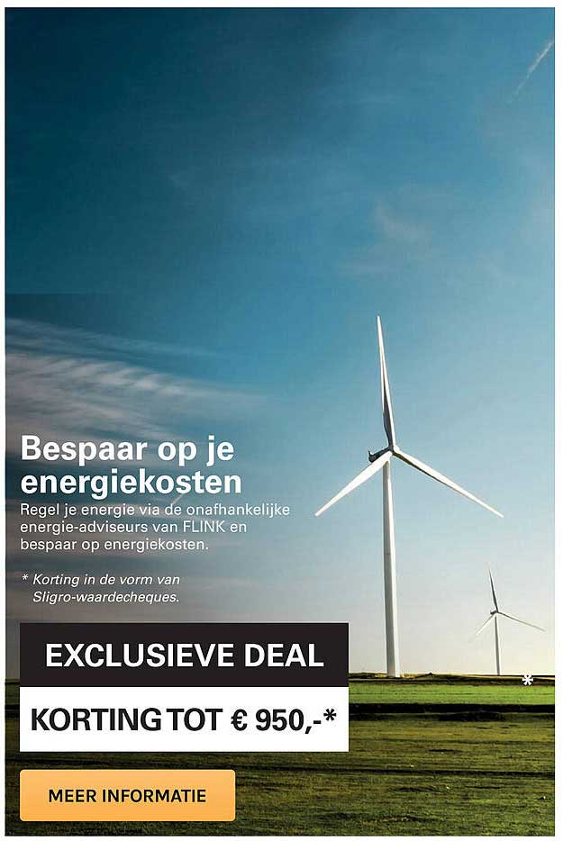 Ben je op zoek naar manieren om te besparen op je energiekosten? Dan hebben wij een geweldige aanbieding voor je! Regel je energie via de onafhankelijke energie-adviseurs van FLINK en profiteer van kortingen tot maar liefst € 950,-. Dit is dé kans om niet alleen je energiekosten te verlagen, maar ook om duurzamer te leven.