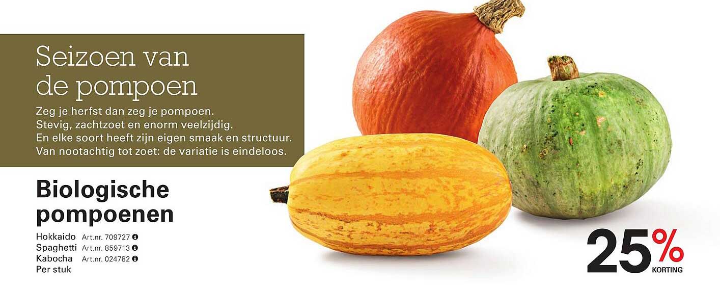 Het is weer die tijd van het jaar waarin we genieten van de rijke, warme smaken van de herfst. Zeg je herfst, dan zeg je pompoenen! Met een korting van 25% is dit het perfecte moment om biologische pompoenen te ontdekken. Van de geurige Hokkaido tot de bijzondere Spaghetti en de zoete Kabocha, elke soort brengt zijn eigen unieke smaak en textuur met zich mee.