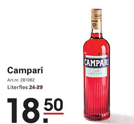 De reguliere prijs van een literfles Campari is €24,29, maar nu kun je profiteren van een scherpere prijs van slechts €18,50. Dit is een besparing die je niet wilt missen! Met deze aanbieding kun je niet alleen geld besparen, maar ook je voorraad aanvullen voor al je toekomstige bijeenkomsten.