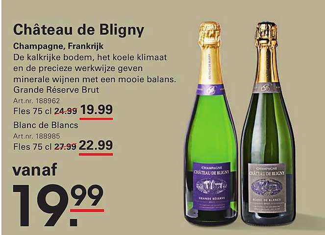 Ontdek de veelzijdigheid van de Château de Bligny champagne, een véritable Franse trots! Deze aanbieding is perfect voor diegenen die willen genieten van een verfijnde bubbel zonder de bank te breken. Met prijzen te beginnen vanaf €19,99 is dit de kans om de perfecte fles in huis te halen voor elke gelegenheid, van feesten tot een ontspannen avond thuis.
