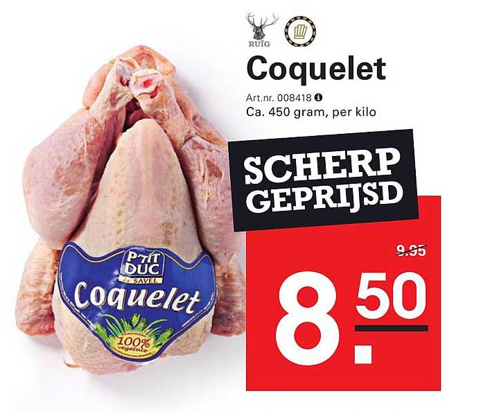 De huidige prijs van de Coquelet is €8,50, terwijl de reguliere prijs op €9,95 ligt. Dat betekent een mooie besparing voor jou! Deze scherpe prijs maakt het nog aantrekkelijker om deze delicatesse aan je boodschappenlijst toe te voegen. Mis deze kans niet!