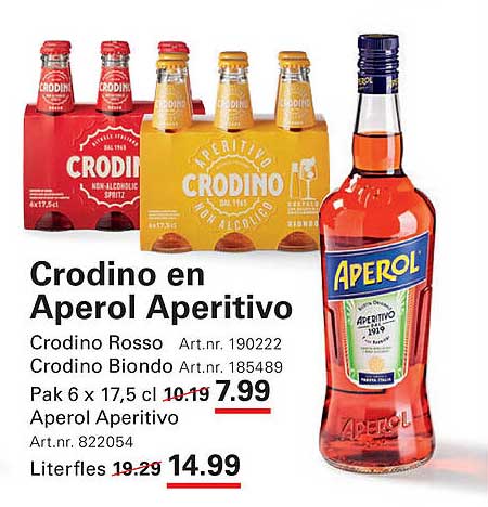 Met een prijs van slechts 7,99 euro voor het Crodino-pakket, dat normaal gesproken 10,19 euro kost, bespaar je €2,20! De literfles Aperol is nu beschikbaar voor 14,99 euro in plaats van 19,29 euro. Deze aanbiedingen bieden je de kans om premium aperitieven te genieten tegen een gereduceerde prijs.
