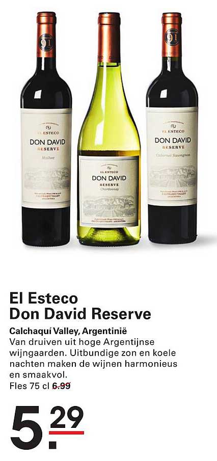 Ben je op zoek naar een uitstekende wijn die niet alleen je smaakpapillen verwent, maar ook je portemonnee? Dan is de El Esteco Don David Reserve een aanbieding die je niet wilt missen! Deze wijn, afkomstig uit het prachtige Calchaquí Valley in Argentinië, biedt een perfecte balans tussen rijke smaken en een betaalbare prijs. Geweldig voor een gezellig diner of een speciale gelegenheid!