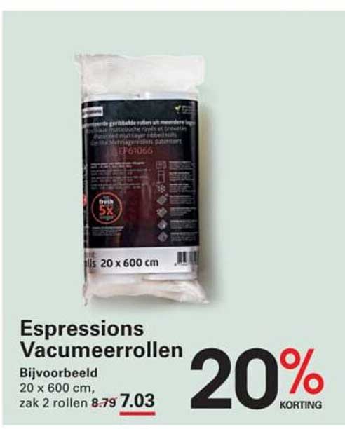 Ben je op zoek naar een handige manier om voedsel vers te houden? Zoek niet verder! De Espressions Vacumeerrollen zijn dé oplossing voor jouw keuken. Met deze rollen maak je eenvoudig vacuumverpakkingen die de houdbaarheid van je voedsel aanzienlijk verlengen. Ideaal voor het rijpen van vlees of het bewaren van groenten, en dat alles met een flinke korting!