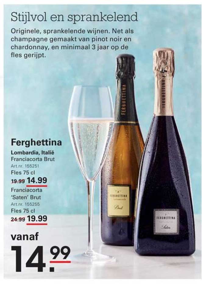 Bij FolderFeest.nl hebben we een waanzinnige aanbieding voor de liefhebbers van sprankelende wijnen! De Ferghettina, afkomstig uit Lombardia, Italië, is een elegante Fransciacorta die onmisbaar is op elke speciale gelegenheid. Met zijn verfijnde smaak en prachtige bubbel is dit de perfecte keuze voor een toast of een romantisch diner. En nu kunt u deze heerlijke wijn kopen voor een aantrekkelijke prijs van slechts €14,99! Dit is een kans die u niet wilt missen.