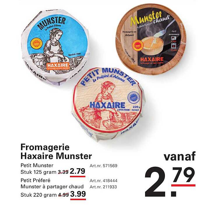 De Fromagerie Haxaire biedt verschillende varianten van Munster aan: de Petit Munster van 125 gram voor een prijs van €2,79 (normaal €3,39) en de Petit Préféré van 220 gram voor €3,99 (normaal €4,99). Beide kazen zijn gemaakt met zorgvuldige aandacht voor kwaliteit en smaak, waardoor ze een echte traktatie zijn voor je smaakpapillen.
