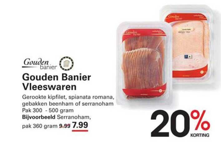 De Gouden Banier Vleeswaren zijn verkrijgbaar in pakjes van 300 tot 500 gram. Een voorbeeld is de serranoham in een pak van 360 gram. Hoogwaardige kwaliteit en zorgvuldig bereid om de rijke smaken te behouden. De producten zijn geschikt voor diverse diëten en kunnen eenvoudig worden toegevoegd aan allerlei gerechten.