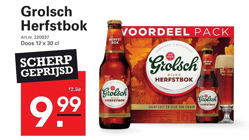 Normaal gesproken kost de Grolsch Herfstbok €12,39, maar nu profiteer je van een scherpe prijs van slechts €9,99. Dit betekent dat je flink bespaart en tegelijkertijd kunt genieten van een uitstekende kwaliteit. Dit is niet alleen een goede deal financieel, maar ook een kans om een heerlijke winterbier te ontdekken.