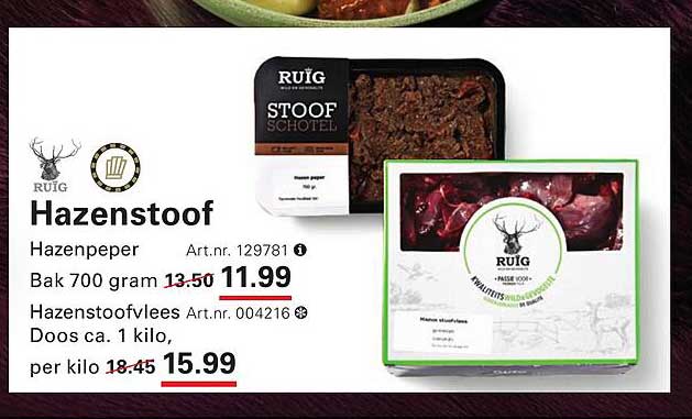 Normaal gesproken kost deze heerlijke Hazenstoof € 13,50, maar nu haal je het voor slechts € 11,99 in huis. Dit betekent een fantastische besparing, zeker voor zo'n premium product. Daarnaast is er ook Hazenstoofvlees beschikbaar in een doos van 1 kilo voor € 15,99, wat een voordelige optie is als je van plan bent om meer te bereiden.